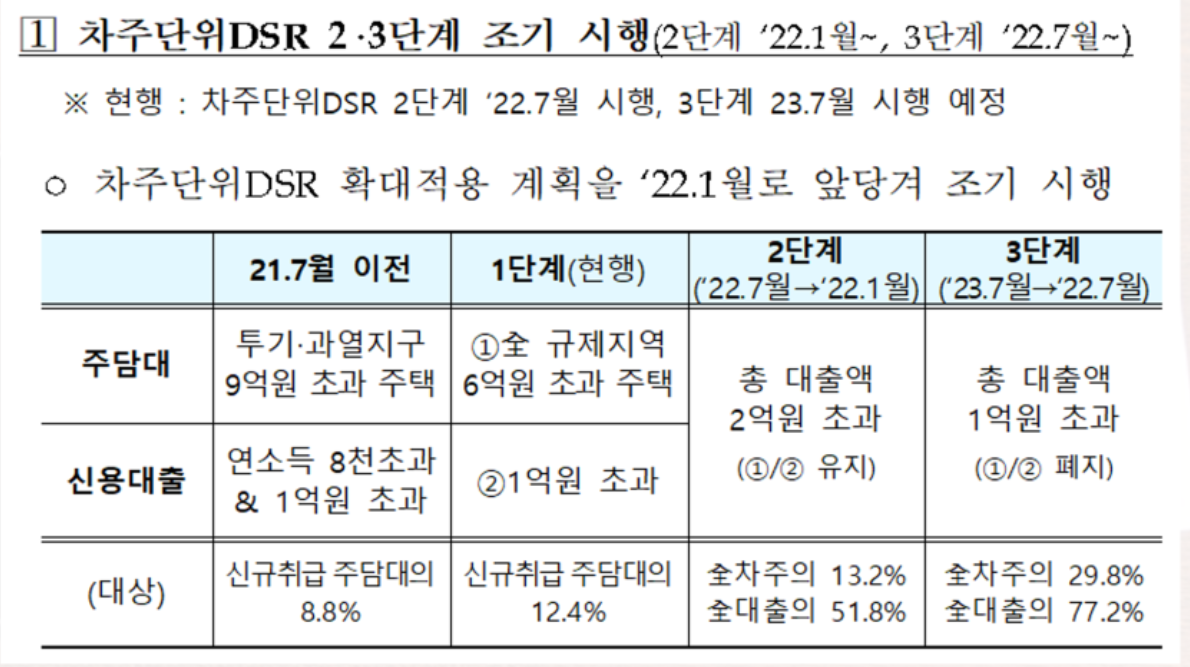 DSR 규제 적용 현황은 위와 같으며 위 그림에서 처럼 적용일정이 당겨져서 2022.1월 이전 모집공고가 난 아파트는 1단계, 2022년 1월 이후, 2022.7월 이전 모집공고가 난 아파트는 2단계, 2022년 7월 이후에 모집공고가 난 아파트는 DSR 3단계를 적용합니다.