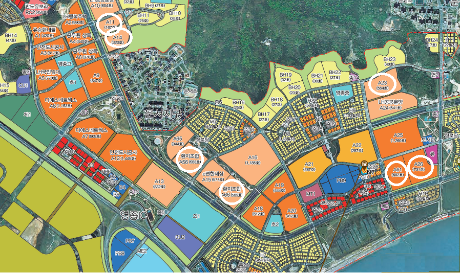 운남동 지역은 2021년에 분양한 대성베르힐 아파트를 중심으로 추가로 3개의 단지가 민간분양 예정이며 대단지가 없는 게 흠이긴 하지만 바다 조망권과 함께 향후 영종도 행정의 중심지라는 미래가치에 힘입어 많은 인기를 끌 것으로 예상됩니다. 다만 바다조망이 확실하게 보장되는 A61, A23은 용지 낙찰가가 평당 700만 원이 넘어 분양가 상승이 예상됩니다.