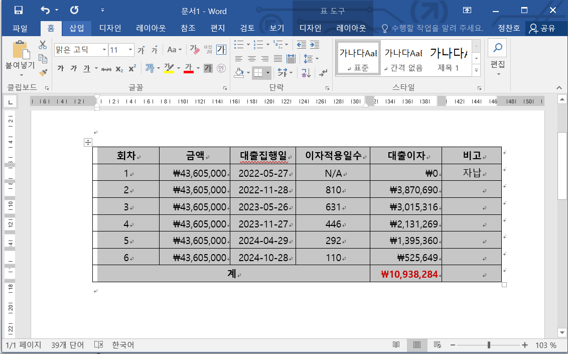 화면에 표가 출력되면 다시 마우스로 붙여 넣기 할 표 범위를 지정하고 Ctrl-C를 누릅니다.