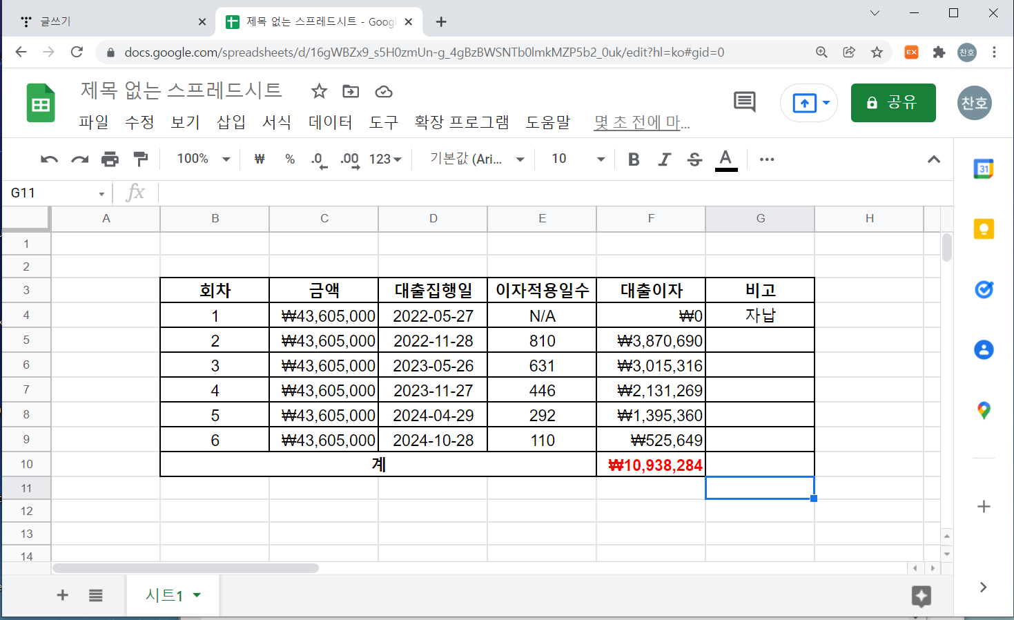 브라우저에서 구글 스프레드시트를 새로 열고 적당한 위치에서 Ctrl-V를 누르면 약간의 시간이 지난 후에 아래와 같이 엑셀에서 복사한 표가 출력됩니다.