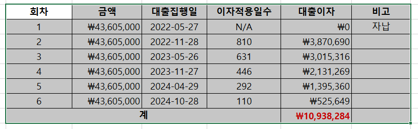 | 회차 | 금액 | 대출집행일 | 이자적용일수 | 대출이자 | 비고 |
