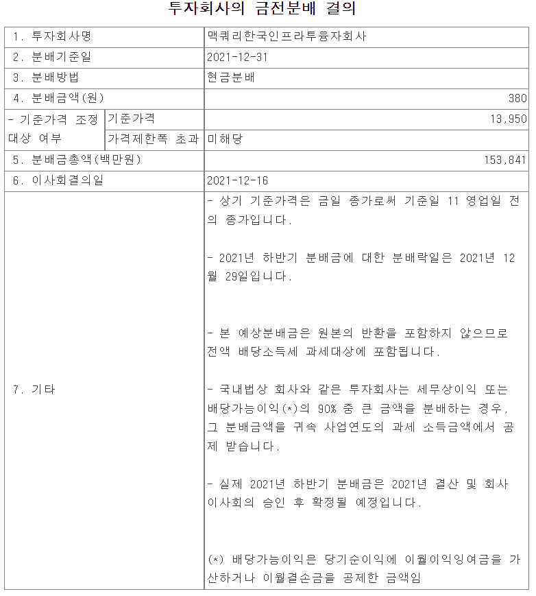 맥쿼리인프라 2021 하반기 배당(분배금) 공시가 나왔다.